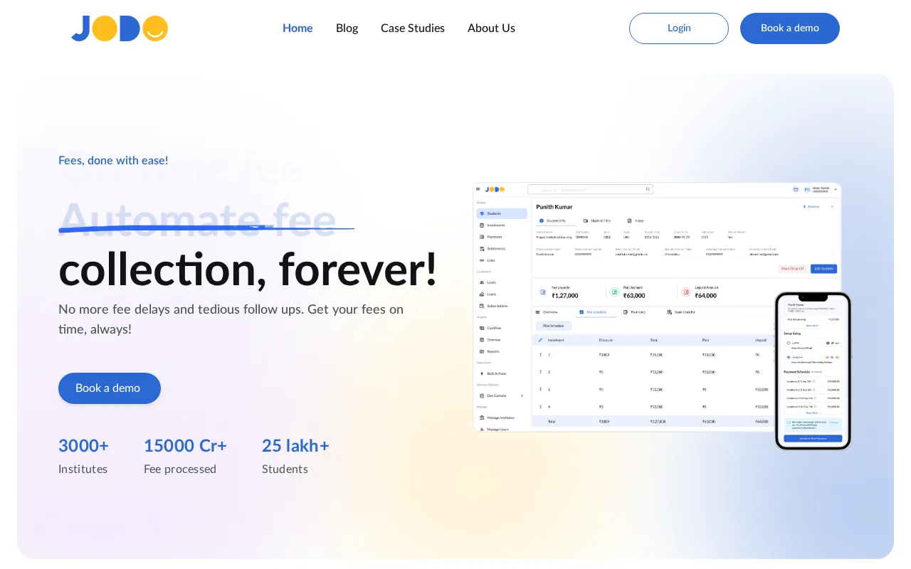 Jodo aims to serve the middle income households in urban India with innovative financial products and services. Their first product is in school fee finance, in which they enable parents to pay fees monthly at no interest.